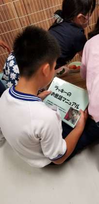 飼育委員会の人たちがぼくのお世話をしてくれてるよ、ラッキー!