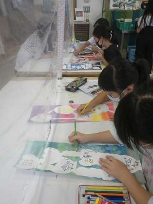 今日は作品の完成日。「家の中やまわりをさらにかきこみ、楽しくてすてきな作品を完成させよう!」というめあてに向けて、一生懸命取り組みました。