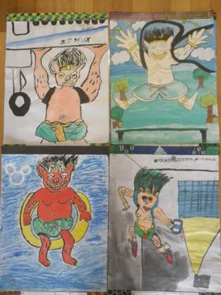 5年生は1学期、「風神雷神なにしてる?」というテーマで絵を描きました。