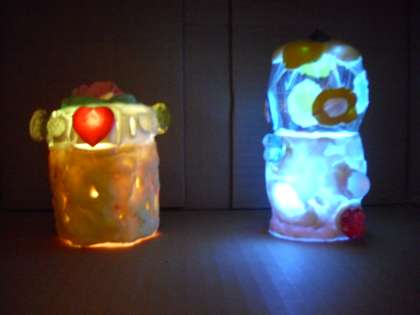 ペットボトルに軽量粘土をつけて、「ゆめ色ランプ」をつくりました。
