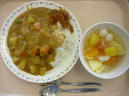 運動会にちなんだ献立です。毎年出している献立ですが、みんなとても楽しみにしています。カレーには、チキンカツがのっています!紅白白玉ポンチの白玉は、白組と赤組をイメージしてつくりました。赤色の白玉は、トマトジュースで色づけをしています。白玉粉を練るときに、豆腐をいれると時間が経っても固くなりません。ぜひ、ご家庭でつくるときも試してみてくださいね。