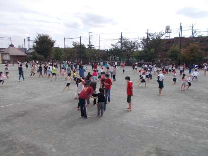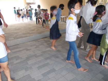 中休み、1年生と6年生が校庭ではだしで遊びました。グループに分かれとても楽しそうでした。
