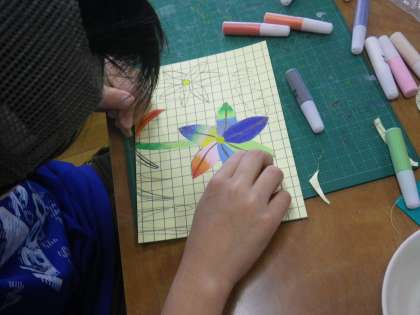カッターでシール台紙を図案通りに切り、砂をのせていく作業はなかなか地道で集中力が必要です。よく頑張りました!!