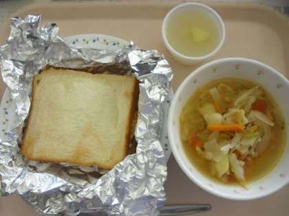 今日は、家庭科の授業で子どもが立てた献立の給食です。夏らしく、貝がらの形のマカロニと夏が旬のトマトをいれたマリンスープと大きめのりんごがはいったハピネスゼリーがさっぱりとしていました。今日は、昼の時間が一年で一番長くなる「夏至」ということで、この献立がぴったりでした。