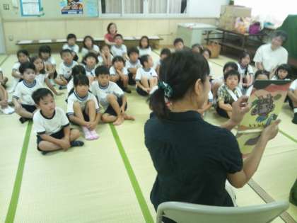 今年度は1年生は数回、読み聞かせを体験することになっています。子どもたちは本を読んでもらうのが大好き。今回も「へそもち」「しりとりの すきな 王さま」など、大型絵本に読み聞かせ、ストーリーテリング等の手法を使って楽しませていただきました。