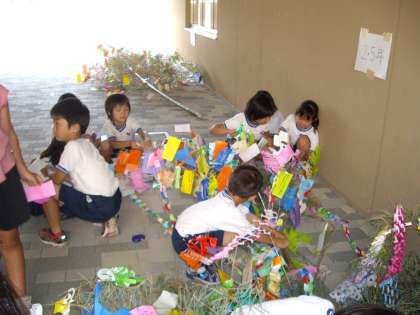 7月7日の七夕の前に、笹に飾り付けをしました。一人1枚短冊に願い事を書きました。「一輪車が乗れるようになりたい」「大きくなったらサッカー選手になりたい」…そして、家族のことを書いている子もいました。
