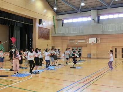 まずは、6年生全員で体育館に集まり、各クラスの鼓笛を見合いました。