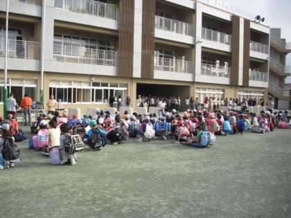 気持ちよい青空の朝 7時20分、多くの保護者や教職員に見送られ