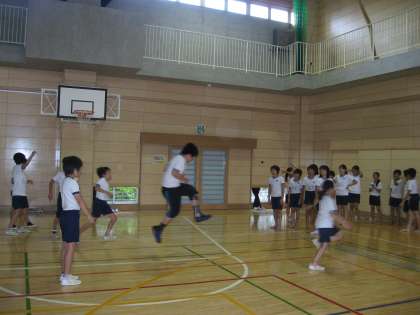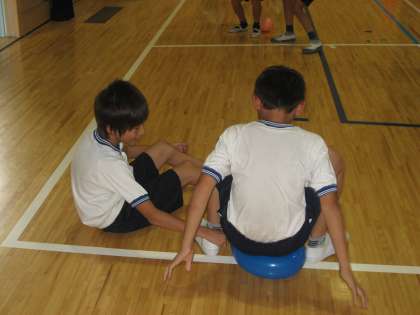 2学期始まってすぐに、学年集会を開きました。まずは、長縄跳びです。10月の連合運動会に向けて、クラス一丸となって跳びました。次に、風船リレーをやりました。背中で運んだり、おしりで割ったりして、みんなでゲームを楽しみました。