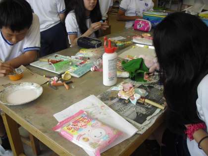 6年生は小学校での展覧会は最後です。福をよぶ縁起物の「熊手」を制作しています。