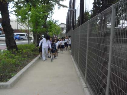 1キロメートルという新しい単位を学習したので、今日は実際に学校の周りを歩いてみました。学校の周りは1周何メートルくらいかな?1キロメートルは何歩くらいで行けるかな?と予想をたてた子どもたちは、真剣な表情で歩数を数えながら歩きました。