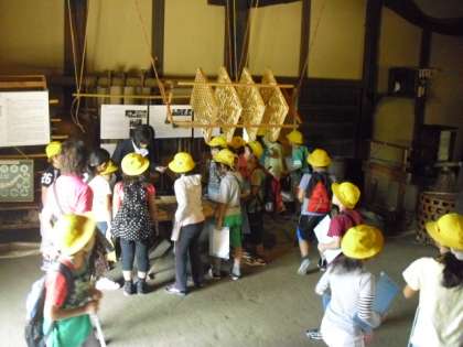 最初に訪れた次太丈夫公園では三件の古民家を見学しました。古い建て物の特徴や当時の生活について係の人の話を真剣に聞いていました。午後のお弁当は砧公園で食べました。緑がたくさんあってとても広い砧公園にみんな驚いていました。お昼の後は等々力渓谷へ行きました。川の流れとともにひんやりとした空気と自然の形がそのまま残っている様子に、感動していました。他にも横穴古墳や九品仏に行きました。