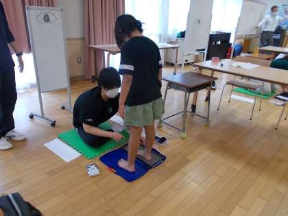・本日、1,3年生の児童対象に日本女子体育大学の先生と業者を呼んで、足型をとりました。本校では、健康教育に力を入れています。その内容の中に足育教育があります。今後も足型をとり、変化を見ていきたいと考えています。