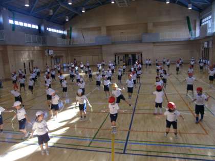 今日の写真は、第二グラウンドの高学年の様子と、体育館の1年生の様子です。