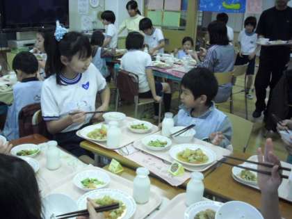 今回は、体育館で一緒にあそんだあと、各教室で給食を一緒に食べました。幼稚園の年長さんとは、来年度給田小学校に入学する子どもたちです。4月に6年生になる子どもたちにとってお兄さん・お姉さんの自覚をもち、一所懸命お世話をすることはとても貴重な経験です。