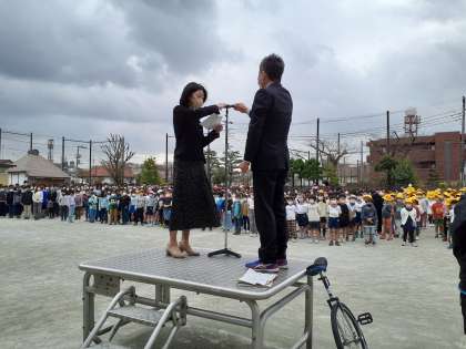 3月13日の全校朝会で、一輪車の贈呈式がありました。