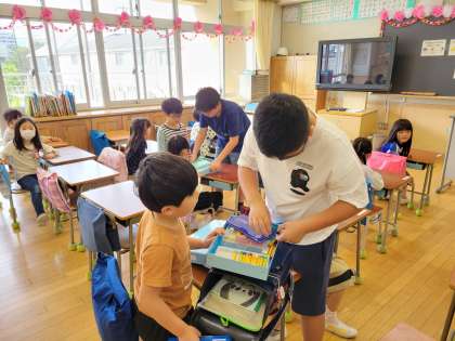 下駄箱でのサポートや、教室でランドセルを片付けたりお道具箱の整頓の仕方を教えたりしています。