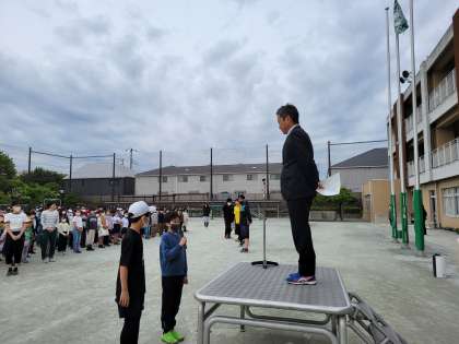 給田小は、全校朝会のたびに6年生が前に立ち、全校の代表で校長先生と朝の挨拶をします。