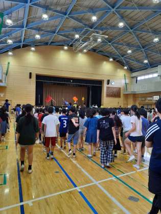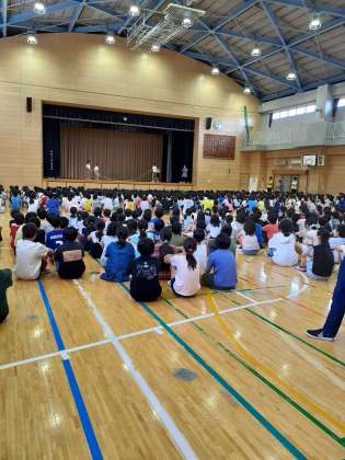 今日は、全校児童が体育館に集まって集会委員会の発表をみました。