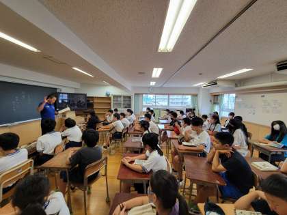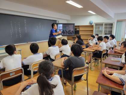 7月13日の着衣水泳を見学する児童に向けて、校長先生が読書感想文についてお話してくださいました。
