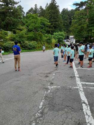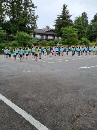 朝のつどいです。天気は曇り空です。子どもたちは、五分前行動、頑張っています。