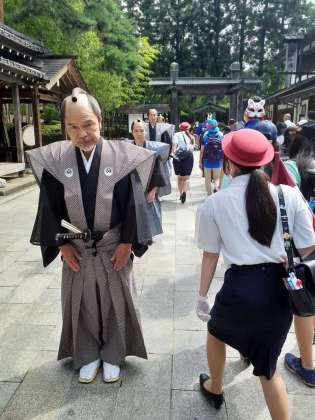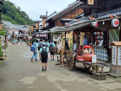 今、江戸村を出発しました。学校に向かいます。色んなお土産を買っていました。