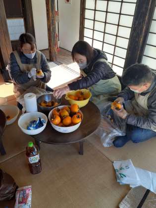 グリーンサポーターズ様に校庭の渋柿を使って干し柿作りをしていただきました。