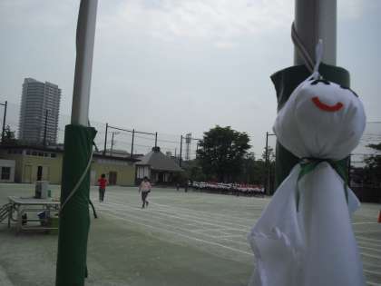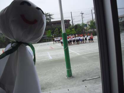 校庭の片隅で、大きなてるてる坊主が運動会の予行練習に汗を流す子供たちを見守っています。