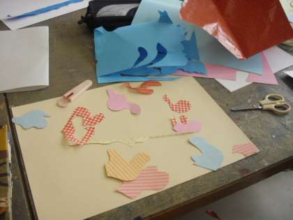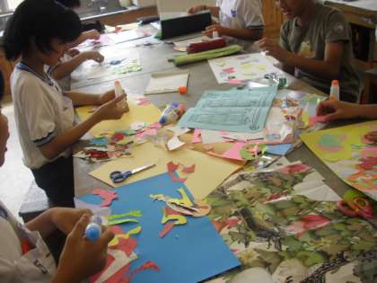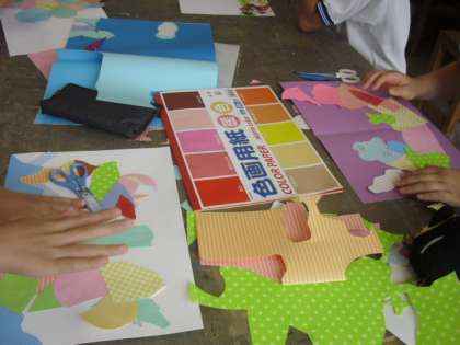 色画用紙と集めた包装紙を使い、はさみを自由に動かしていろいろな形の紙を切りました。切った紙を画用紙の上に置いていきながら、色や形を考えて画面構成をし、出来た作品から感じられるイメージで題名をつけました。色合いを考え、切った形をいかしたハイセンスな作品作りが出来ていました。
