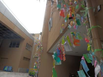 中庭には全校の子どもたちの願いごとを託した笹飾りが風にゆれています。