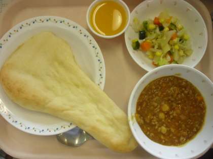 二学期が始まりました。一日おくれで、給食も始まりました。二学期最初の給食は、みんな大好きなカレー!大きな大きなナンにカレーをつけて、ぱくっ!いただきまーす。
