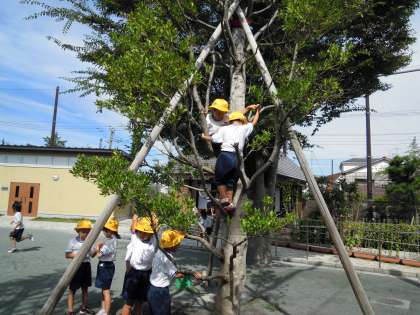 1年生は、1学期と夏休みを過ごしていく中で、少しずつたくましくなってきています。遊び方の幅が広がりました。給田小の伝統の一つである木登りにチャレンジしています。 おそるおそる枝に手をかけ、足をかけ、登っていく様子がとても素敵でした。木の上から見える景色はいつもの校庭とちょっとちがって、きもちがよさそうでした。ルールを守ってけがの無いように遊びましょう。