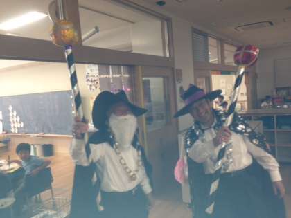 [2012年10月31日(水)] 今日はハロウィン! 公開日 2012/10/31 更新日 2012/10/31 行事 お隣の給田幼稚園で使った衣装をお借りして、遊び心いっぱいの魔法使いが、 給田小の給食中に現れました! 子どもたちは大喜び! すぐに校長先生と副校長先生だとわかりましたよ! いいね(0)