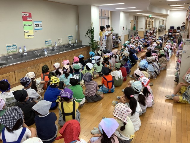 栄養士さんの話を聞き、とうもろこしが上向きに生えていることや皮むきの仕方を静かに聞くことができました。