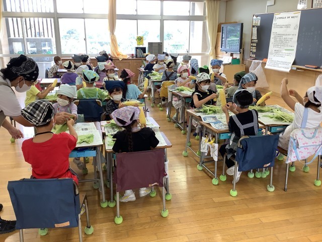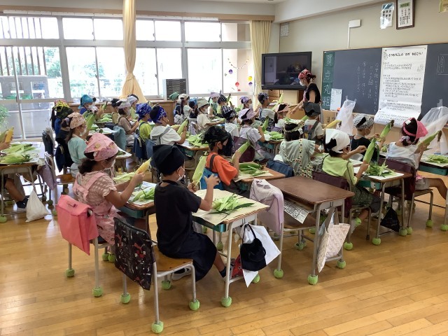 今日の1時間目にとうもろこしの皮むき体験を行いました。