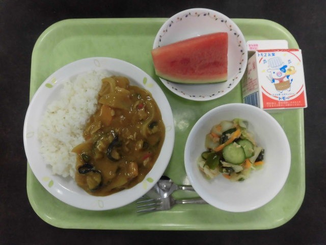 一学期最後の給食は、夏野菜のカレーライスです。なす、かぼちゃ、ピーマンなどの夏野菜が入っています。太陽をたっぷり浴びて育った夏野菜は、ビタミン類が多く含まれ、体の調子を整えてくれるはたらきがあります。