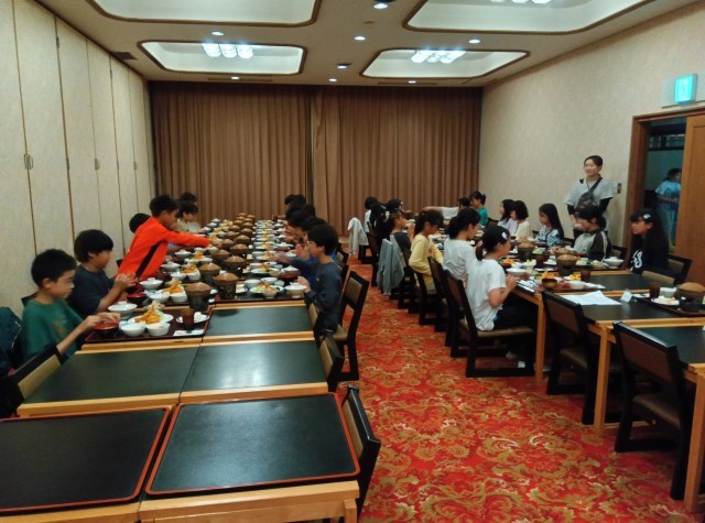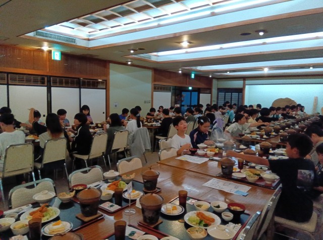 日光林間学園初めての食事です。ボリュームのあるメニューですが、よく食べている子が多いようです。何度もご飯のおかわりをしている子もいます。