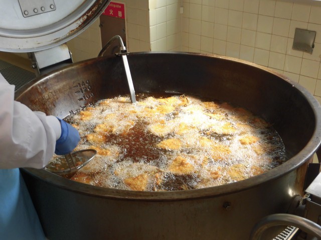 今日の主菜はアジフライです。給食では魚をおいしく食べられるように工夫して調理しています。今日は「あじ」という魚に、パン粉を付けて油で揚げました。
