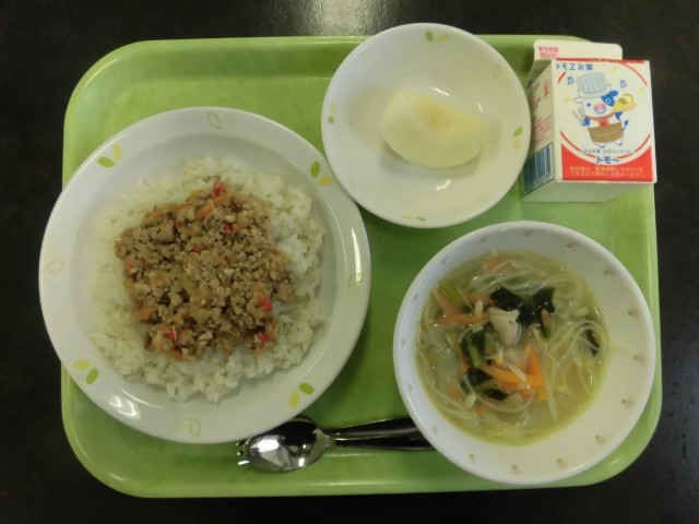 今日の給食は、新メニューのガパオライスです。ガパオライスは、タイの料理です。