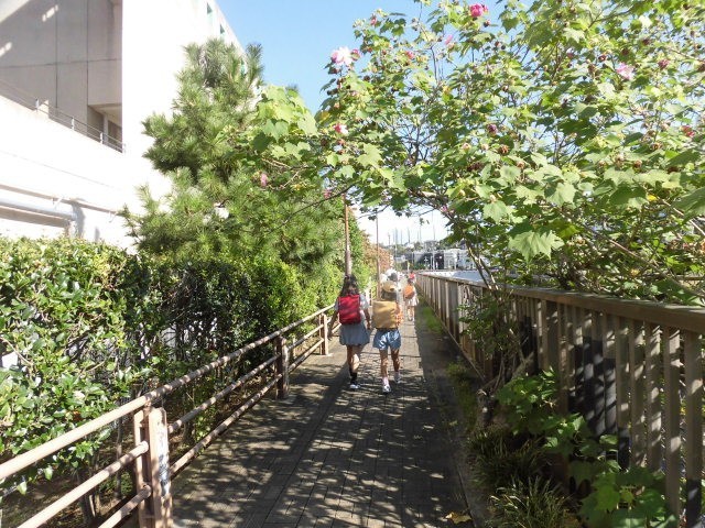 さわやかに晴れた朝、子どもたちの登校時間です。今日は、正門近くの木にスズメバチの巣があることから、正門を通らずに北門や裏門から学校に入るようにしました。川沿いの道を通って登校するのは、高学年にとっても初めてのことだそうです。いつもより遠回りになってしまった子たちもいたかもしれません。いつもと違う門なので、少し早めに登校したという子もいました。