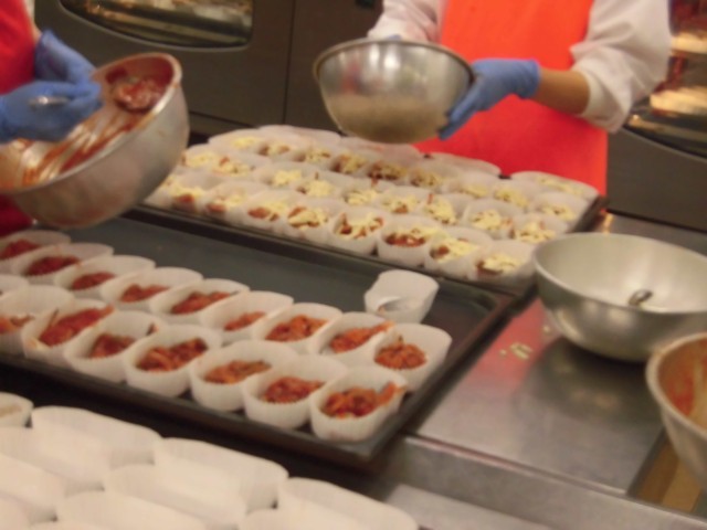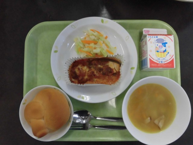 今日の主食は「鮭のピザ風」です。骨や歯をじょうぶにするために、カルシウムが多いチーズを使った料理です。今日は、鮭にトマト味のピザソースとチーズをかけてオーブンで焼きました。