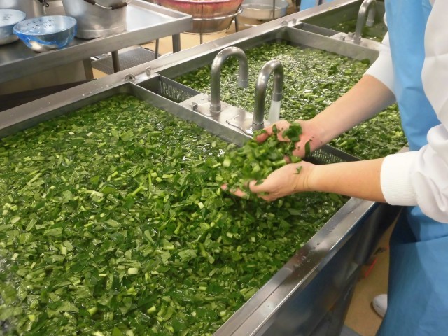 今日の主菜は筑前煮です。油で材料を炒めてから煮るので、コクが出ておいしい煮物に仕上がります。鶏肉、野菜、いも、しいたけ、こんにゃくなどたくさんの具材が入っているので、栄養も満点です。野菜を洗う時は、切る前・切った後に異物がないか入念に確認しています。