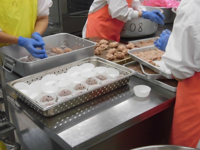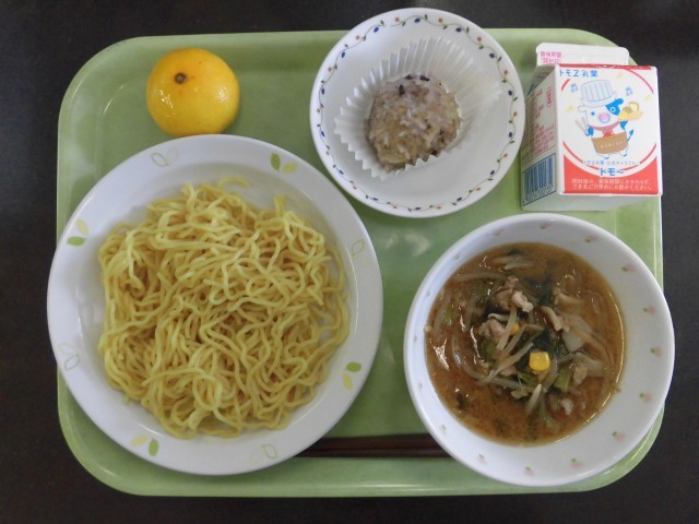 今日の給食は、リクエストの多いみそラーメンです!朝早くに、かつお節のだしと鶏ガラのだしをとり、じっくり煮込んで作りました。珍珠丸子は、肉団子にもち米をまぶして蒸した料理です。