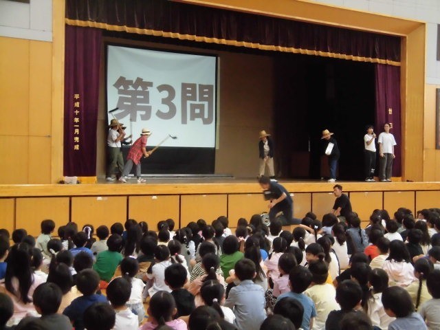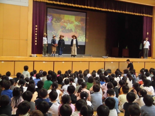 朝の活動時間、集会委員会による行事集会がありました。集会委員が小道具を用意し、寸劇で楽しい発表をしました。子どもたちにとっては、身近で興味のある「祭り」のようです。今日の発表に向けて、集会委員のみんなが頑張って用意していました。フェスタ前で忙しいなかでも、委員会活動も頑張っている高学年です。