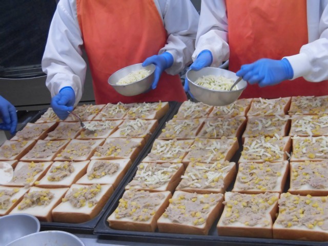 写真は、ツナコーンチーズトーストを作っている様子です。