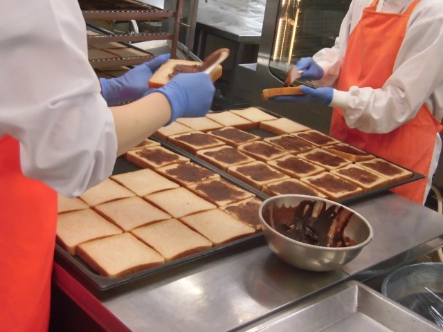 今日の主食は、胚芽ココアトーストです。胚芽パンという茶色いパンを使っています。今日は砂糖とココアをまぶし、小麦の風味と甘さがおいしく感じられるように作りました。