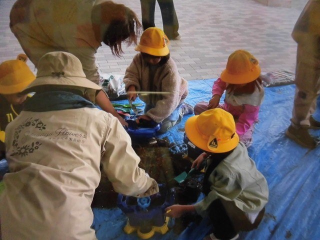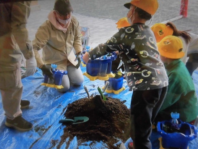 学校公開期間2日目、1年生が寄せ植えを行っています。地域の園芸農家の方をゲストティチャーにお招きしました。すでに花を付けている苗もあり、「紫色のパンジーきれいだね」「大きな花を咲かせよう」などと話しながら、作業に取り組みました。この寄せ植えは、来年の春に新入生を迎える昇降口までを飾る鉢植えになります。自分たちもそうしてもらったように、今度入学してくる子どもたちに喜んでもらえたらいいねと、先生からのお話を聞いていました。