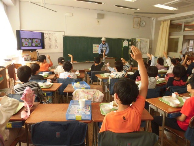 2年生の教室で給食前の時間、栄養士の先生による「食育」の指導がありました。食器の並べ方についてです。学校給食では和食の場合に並べ方を基本としています。子どもたちはよく話を聞いて、早速自分の食器を並べ替えていました。ご家庭でも習ってきたことを実践できるといいと思います。