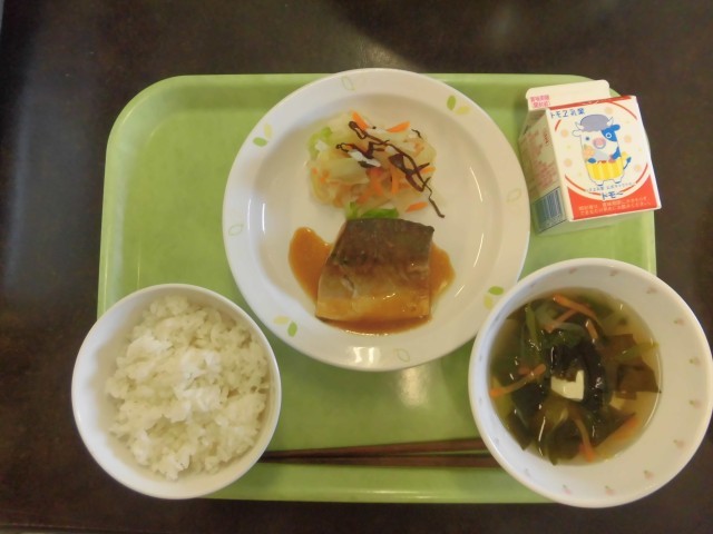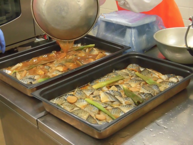 新米の季節になりました。今日のごはんは、「有機米」を使っています。今日は秋田県産の「あきたこまち」を使いました。写真は、さばのみそ煮を作っている様子です。