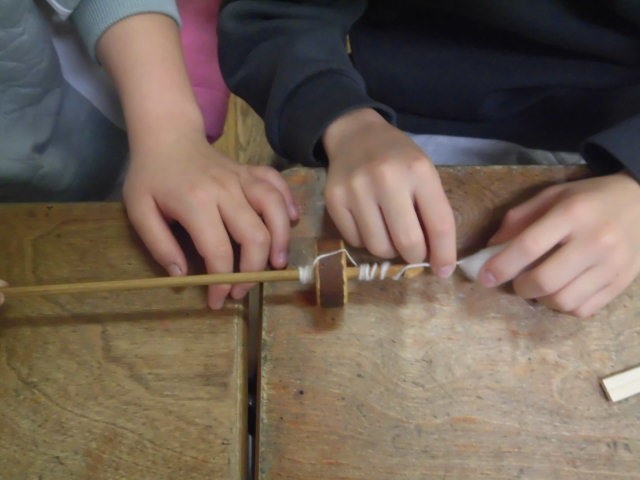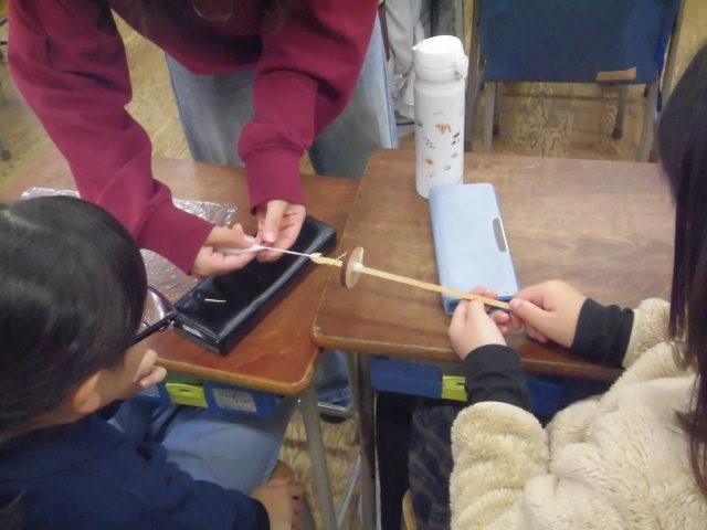 4年生が「和綿プロジェクト」という学習に取り組んでいます。今週は、ゲストティチャーの方に教えてもらいながら、収穫した綿を糸に紡いでいる作業をしています。力の加減や糸によりをかけるのが難しそうですが、がんばって挑戦していました。紡いだ糸を使って、何を作るのでしょう。4年生に聞いてみましょう。